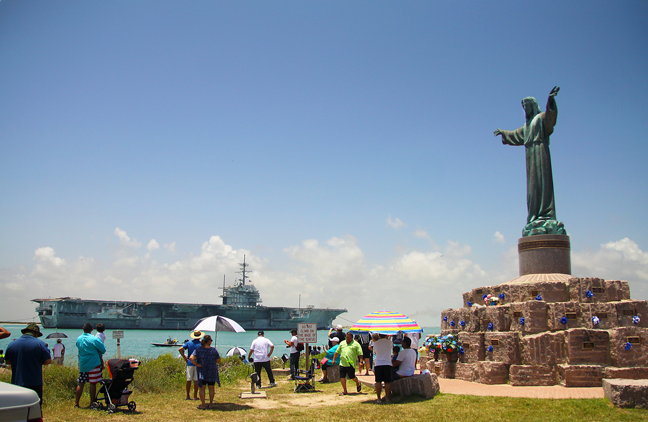 The South Padre Island side of the jetties at Isla Blanca Park were lined with hundreds of spectators, many of them veterans, like Costin, who had served aboard the ship during her nearly 60 years of service.