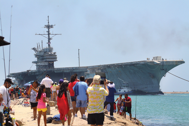 The Ranger, one of four angled deck supercarriers commissioned for the U.S. Navy in the 1950s, arrived in the Rio Grande Valley on a sweltering Sunday afternoon on its way to be dismantled. Commissioned in 1957, the ship served primarily in the Pacific, earning 13 battle stars in the Vietnam War. She also served in the Indian Ocean and Persian Gulf before being decommissioned in 1993.