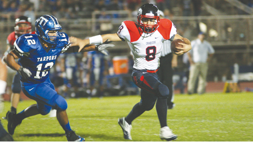 Tarpons linebacker James Ramirez reaches for the ball in a play on Friday evening at Tarpons’ field. (Staff photo by Ray Quiroga)