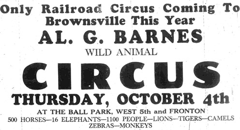 It was during the “Depression,” in 1934, that the spectacular train circus came to Brownsville. The circus industry had survived the stock market crash of 1929, but by the early 30s it was losing its audience. It came to the point that circus goers were exchanging their entertainment nickels to buy a piece of bread.