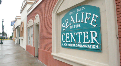 Dolphin whisperer Scarlet and George Colley are shown with their dolphin dog, Rozzi, inside the Dolphin Research and Sea Life Nature Center, which is also shown (below). (Staff photos by Ray Quiroga)