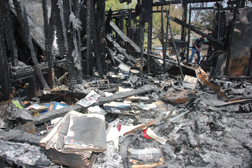 Ernestina Martinez stands in the ruins of what was once her proud home after it was destroyed in a fire. Martinez is holding one of her only remaining personal possessions, a page from one of her children’s yearbooks. (Staff photos by Ray Quiroga)