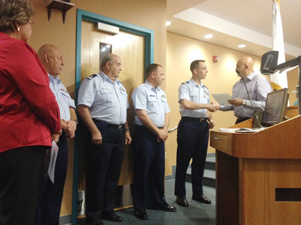 SPI Mayor Barry Patel presents Lt. Cmdr. William Bell with a proclamation welcoming him, on behalf of the City, as the new SPI Coast Guard Station commander. (Dina Arévalo/Staff photographer).