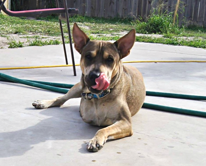 Rounder, a three-year-old mixed breed Chinese Shar-Pei and possibly German shepherd, was found a year ago wandering the streets of Hidalgo County and was brought in to the Laguna Madre Humane Society shelter with a major medical concern. At the time, his front right leg was unusable because he had been shot at close range with a shotgun by his former owner.