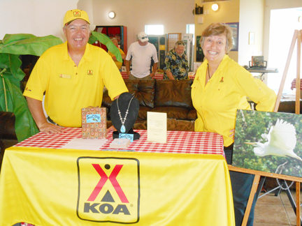 Tom and Stacie Brooks are the managers of the SPI KOA and have almost 19 years with the company. Tom said, “We’ve worked at six different KOA locations, from coast to coast and north to south, but we try to avoid the north if we can!” he said, laughing. This was the first year the raffle and auction were open to the public – in the previous two years, only KOA campers could attend. This year’s event offered about 60 silent auction items, 40 raffle items, and a live auction, including gourmet baked goods, jewelry, original art, gift certificates and services from more than 50 area businesses, restaurants and private donators. There were also three different entertainers, with Karl Mathew, Doug Perser and Roland Z performing for the attendees throughout the afternoon.