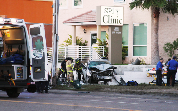 Paramedics prepare to transport a passenger who was rescued from a 2004 Ford Focus Sunday, March 22, 2015. The Focus and a a taxicab collided while traveling northbound on Padre Boulevard. In total, five people were injured. (Staff photo by Dina Arévalo).