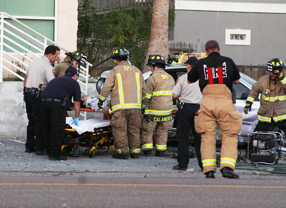 South Padre Island firefighters remove a passenger trapped inside a 2004 Ford Focus Sunday, March 22, 2015. The Focus and a taxicab collided while traveling northbound on Padre Boulevard. In total, five people were injured. (Staff photo by Dina Arévalo).