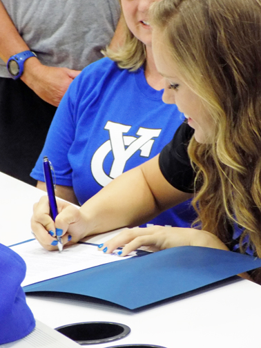 “I’m very proud of her dedication,” Swink’s father, P.D. said after the signing. “Kelcie’s never been the top talent but she’s always worked hard at whatever she does. As to her decision to go to York, her mother and I tried to stay out of it. She had options. We think she chose well.”