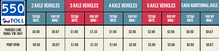 The new State Highway 550 (SH 550) in Cameron County had its cashless  toll gantries upgraded  to assist customers in making their payments on time to avoid penalties, and ultimately prosecution. Drivers are charged when they drive through each gantry at their respective rate with Pay By Mail (view image below).   Currently, Pay By Mail has been the preferred method of payment for many drivers that currently use SH 550. Customers receive a bill by mail, which includes a $1.00 processing fee in addition to the toll fees for using SH 550. Customers are encouraged to register for a TxTag account, which provides drivers with an electronic sticker transponder that carries their account information. Each time a vehicle passes through a gantry on SH 550 using TxTag’s windshield sticker transponder, toll fees are automatically deducted from customer accounts making toll payments easier and efficient for drivers. Drivers can also use PToll™ on their mobile devices to register vehicles before driving through SH 550. These alternate methods of payment can save drivers up to 40% on their toll fees, and they are hassle-free. The Cameron County Regional Mobility Authority highly encourages that residents register for their TxTag or PToll™ account by visiting their official website at www.ccrma.org.
