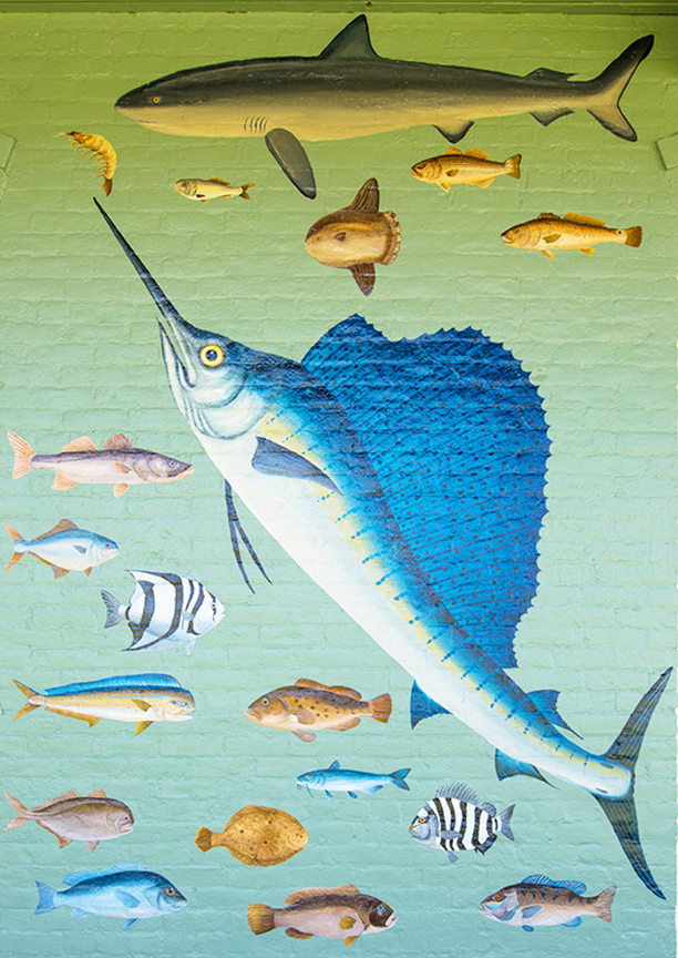 The colorful mural which covers the façade of the two-story building with images of native marine life underwent a restoration. Harlingen artist Angel Hernandez, who painted the mural on the nearby Port Isabel Event and Cultural Center, was tasked with bringing the faded century-old figures back to life.