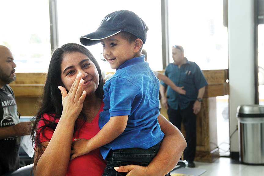 Dunia, a 24-year-old migrant from Honduras, cries as she holds her son, Wuilman, just moments after being reunited with him at the Brownsville – South Padre Island Airport Friday.
