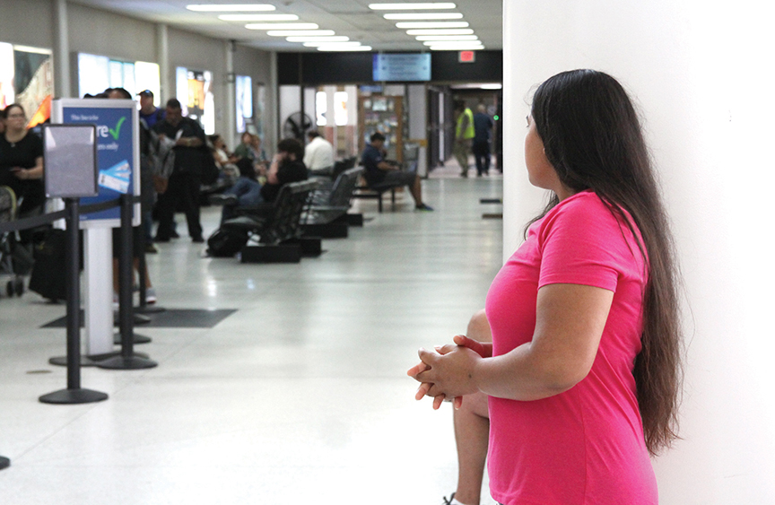 Dunia stood with her hands clasped at her waist, fingers interlaced, looking past the long line of people who had recently arrived at the Brownsville – South Padre Island International Airport Friday morning. She was anxiously awaiting the 10:42 a.m. arrival of an American Airlines flight from Los Angeles, where her 5-year-old son had been taken by government officials after the pair had been separated in Texas.