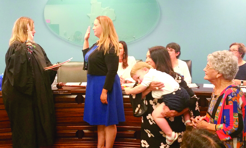 Newly elected superintendent of schools for the PIISD, Teresa Ann Alarcon, began the festivities by introducing the daughter of board member Diane O’Leary, who is stepping down from the board after six years of service. O’Leary was unable to attend the ceremony, so daughter Caitlin accepted a plaque on her mother’s behalf.