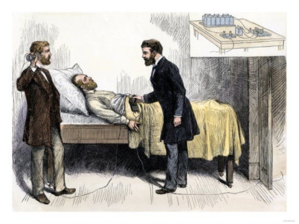 After reading of Newcomb’s experiment Alexander Bell telegraphed Newcomb in Baltimore and offered to assist him with his own invention. Bell’s telephone amplified sound through wire! The device the two managed to put together consisted of fine needle connected by wire to one terminal of a telephone while a metal plate (laid upon the skin) was connected to the other terminal. The needle was then inserted into the flesh near where the bullet was suspected to be. If all worked well, when the needle came close to the bullet an electric current created between it and the metal plate would produce sound.