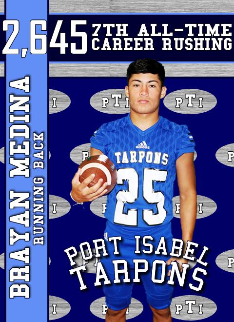 In the week six game versus the La Grulla Gators Tarpons’ running back, Brayan Medina rushed for a team high 156 rushing yards on 28 carries. That brought his total career rushing yards to 2,645 yards. That ranks Medina in 7th place on the Port Isabel All-Time Career Rushing list. With the changing times, Port Isabel’s offense long known for their rushing proficiency have since 2017 moved on to have a more balanced offense. Medina’s varsity career started in the Tarpons first year of offensive transition, so Medina’s accomplishment is more astonishing.