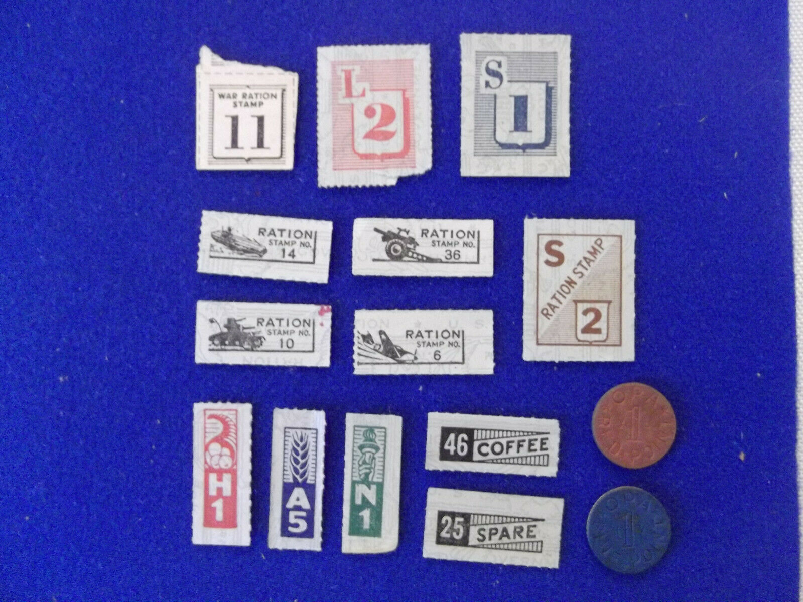 To enable making change for ration stamps, the government issued “red point” tokens to be given in change for red stamps, and “blue point” tokens in change for blue stamps. The red and blue tokens were about the size of dimes (16 mm) and were made of thin compressed wood fiber material, because metals were in short supply.