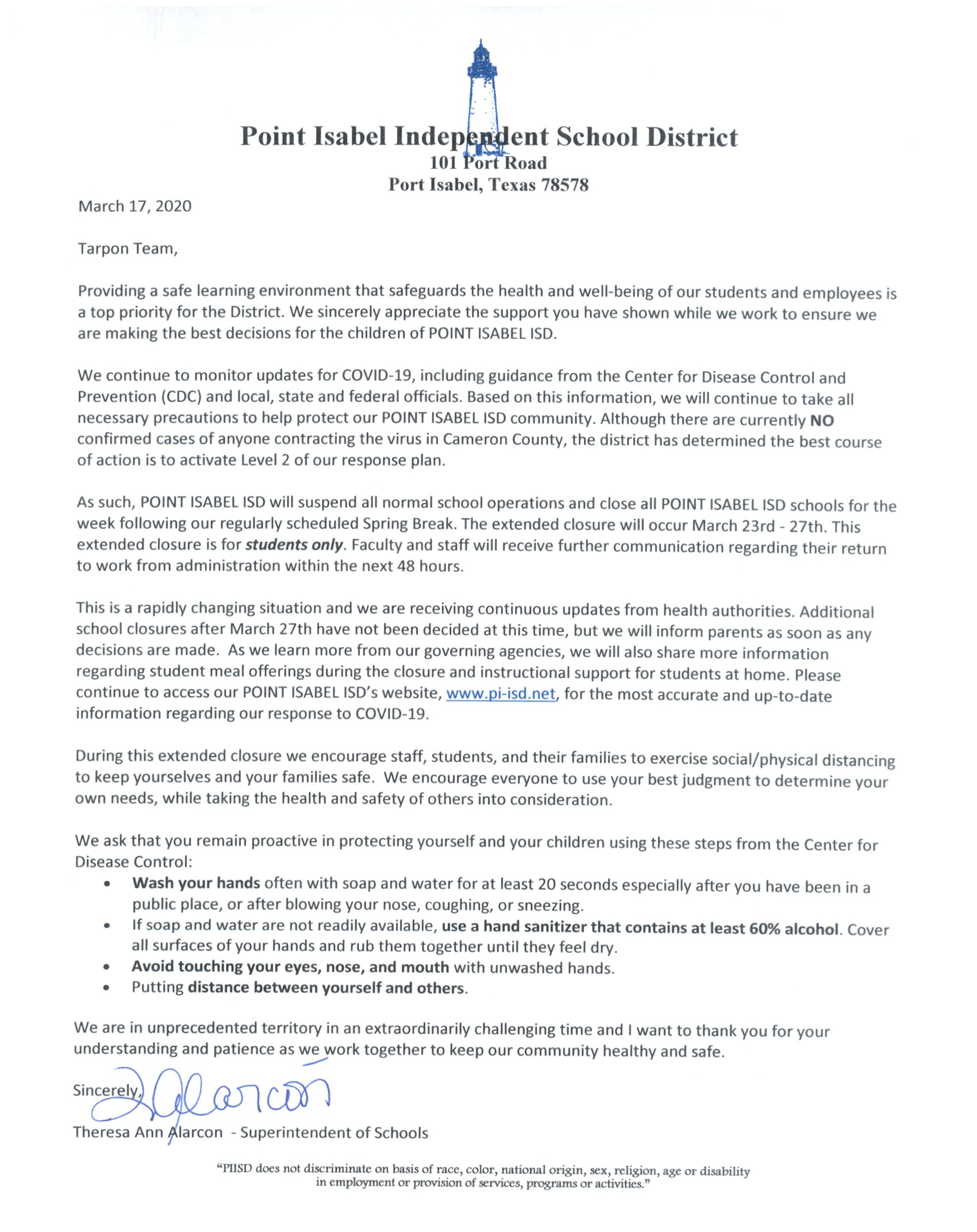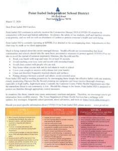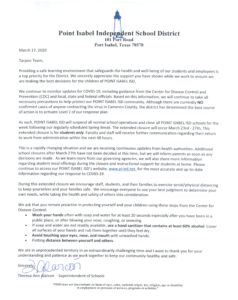 The extension, from March 23 to March 27, was made out of concern for the novel coronavirus COVID-19 pandemic, a March 17 media release from PI-ISD superintendent Theresa Alarcon stated. PI-ISD is now in Level 2 of the district’s response plan.