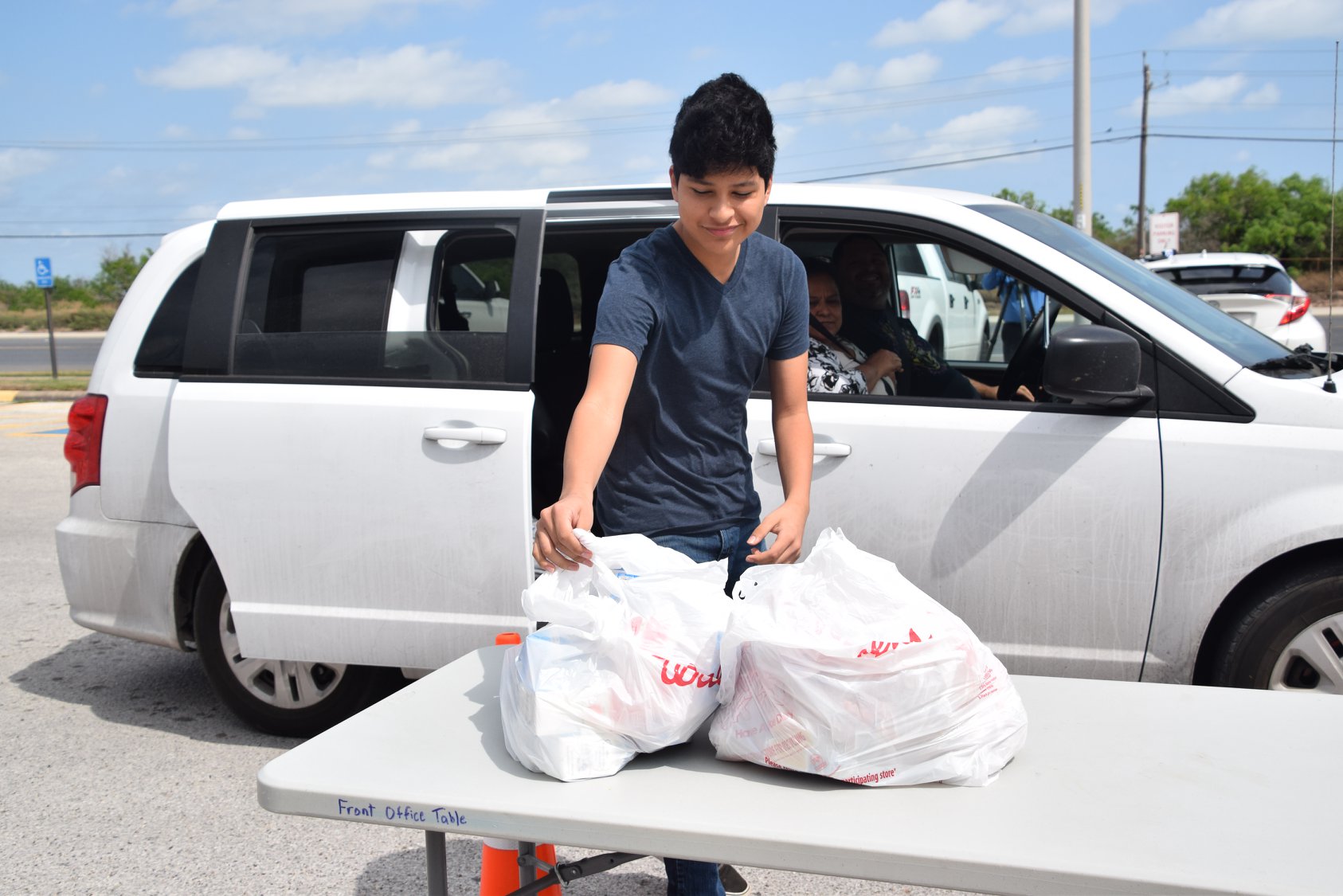 A student picks up meal bundles in front of Port Isabel High School. Point Isabel Independent School District now runs their food distribution program on Mondays and Wednesdays. Photo courtesy of PI-ISD.