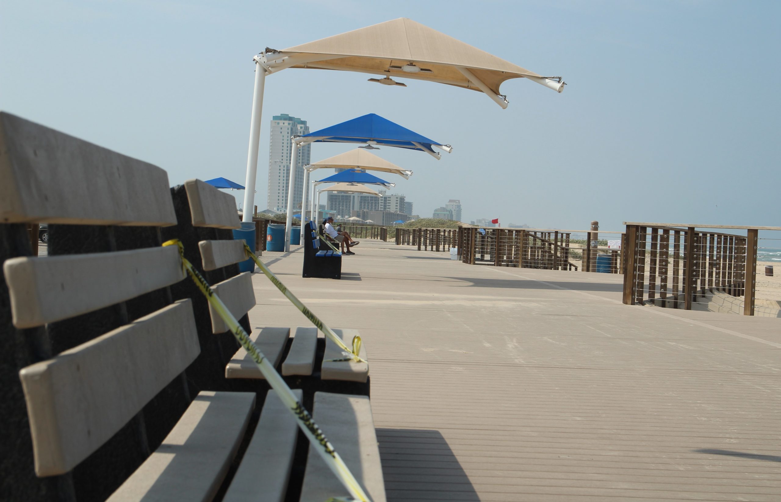 A taped-off bench at Isla Blanca Park’s Boardwalk on April 25, the first day of Cameron County’s parks partial reopening. The bench was one of several taped-off in an effort for park visitors to practice social distancing. Photo by Gaige Davila.