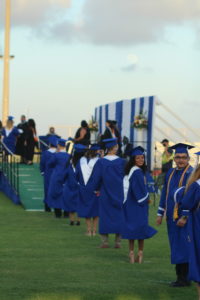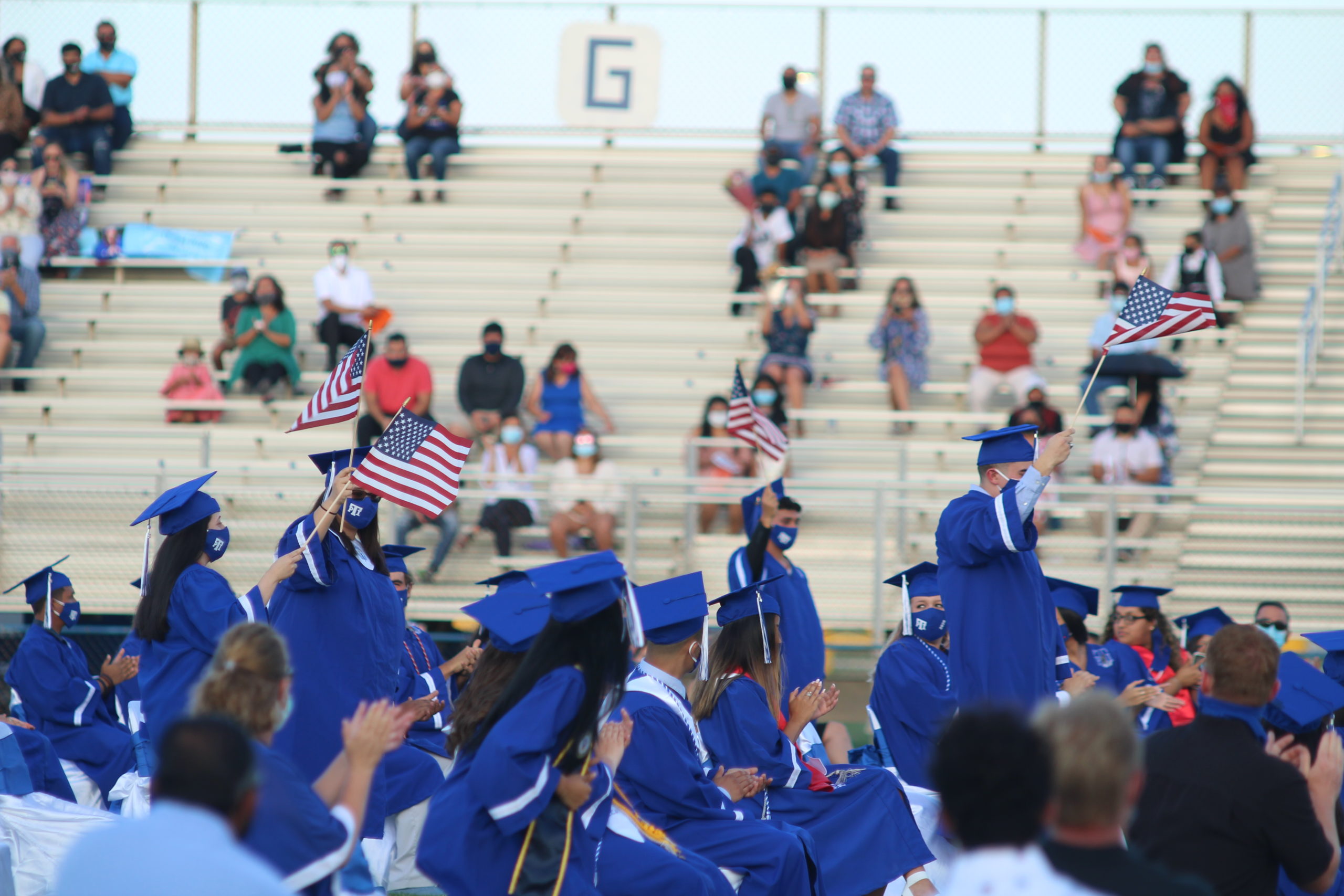 Every graduating student was allowed to bring four guests, who sat on either side of Tarpon Field in the bleachers, six feet apart, while the former students did the same on the field.