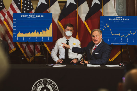 Texas Governor Greg Abbott points to a chart detaining rising COVID-19 cases in the state during a press conference on June 22. COVID-19 cases in the state hace increased exponentially since Abbott issued orders to “reopen” the state on May 1. Photo courtesy of the Office of the Governor.