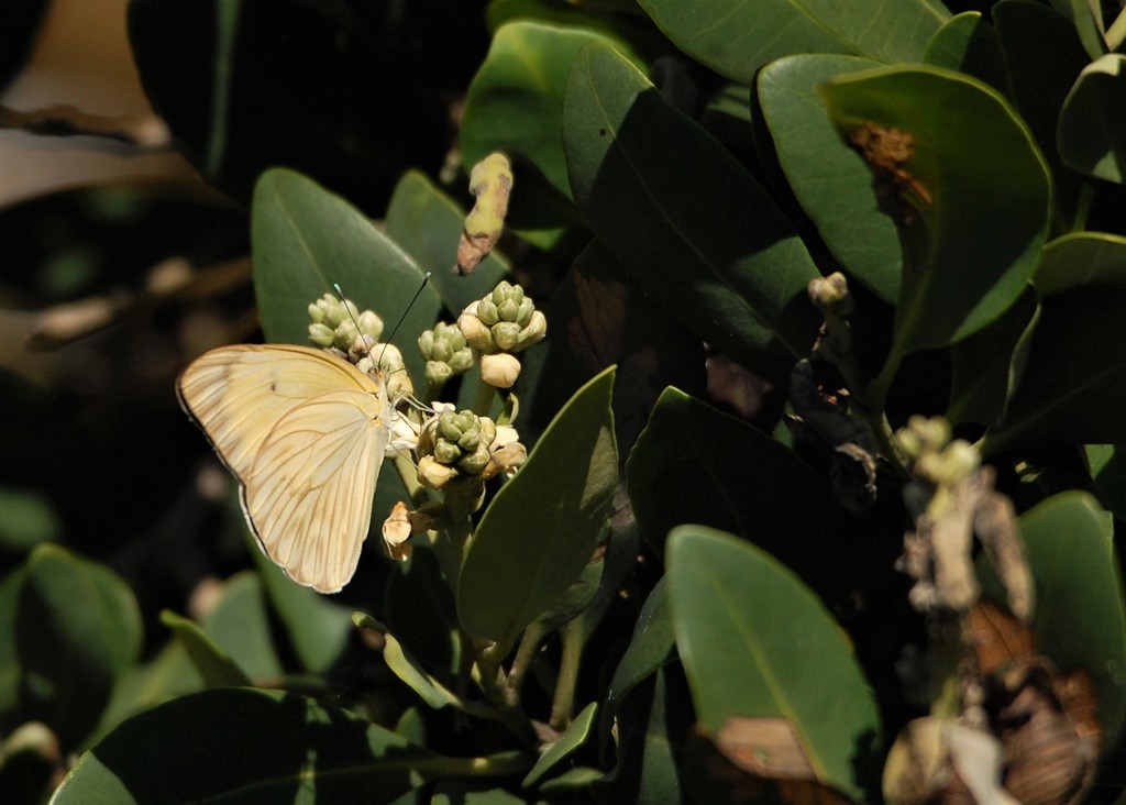 With the returning adults also come a number of juvenile birds that have just started to explore life on their own. It is easy to tell the juveniles as they often look different than the adults and have an inexperienced and dopey look to their faces. Watching them learn the ropes of living on the wetlands is always an interesting and, at times, funny experience. Summertime also brings a burst of flowers and insects to the marsh. Black Mangroves only flower during the summer, and their tiny white flowers can completely envelop the tree. The flowers’ nectar attracts a myriad of freshly emerged Great Southern White butterflies that swarm all over the marsh. Their caterpillars feed on the Saltwort that grows with abundance adjacent to the mangroves.