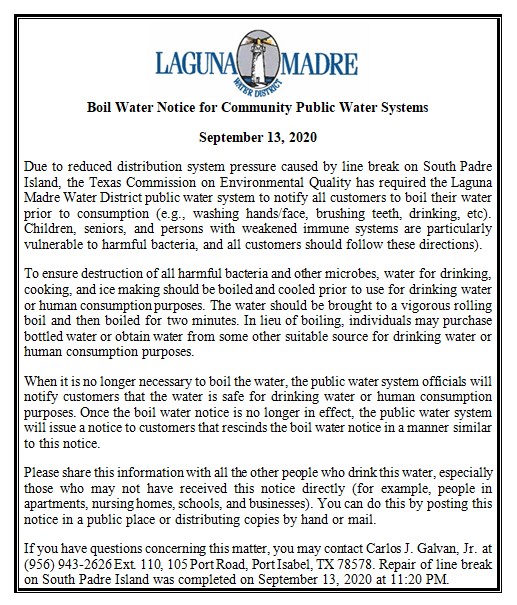The Laguna Madre Water District has issued a boil notice after repairing a broken waterline on South Padre Island.