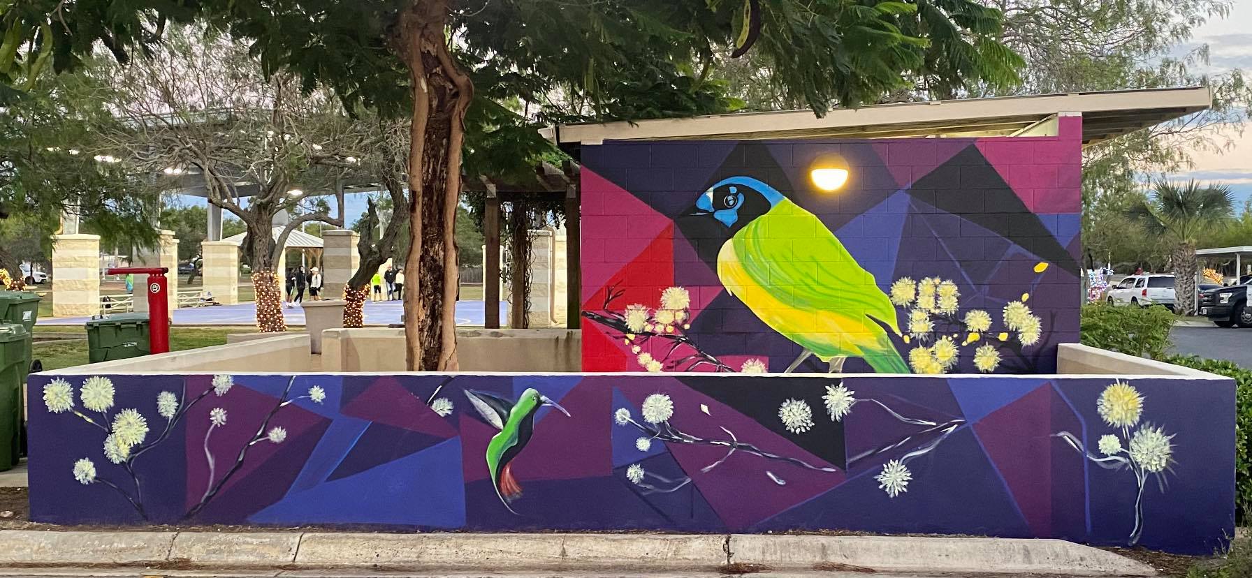 Visitors will notice that Roloff Park has gotten more colorful than last year, thanks to a mural painted by Christina Salazar. The mural, featuring a green jay and humming bird surrounded by shades of blue and purple, is in memory of Mia Zamora, a Port Isabel child who died from cancer last September. The mural was commissioned by the Town of Laguna Vista to add more art to the community.