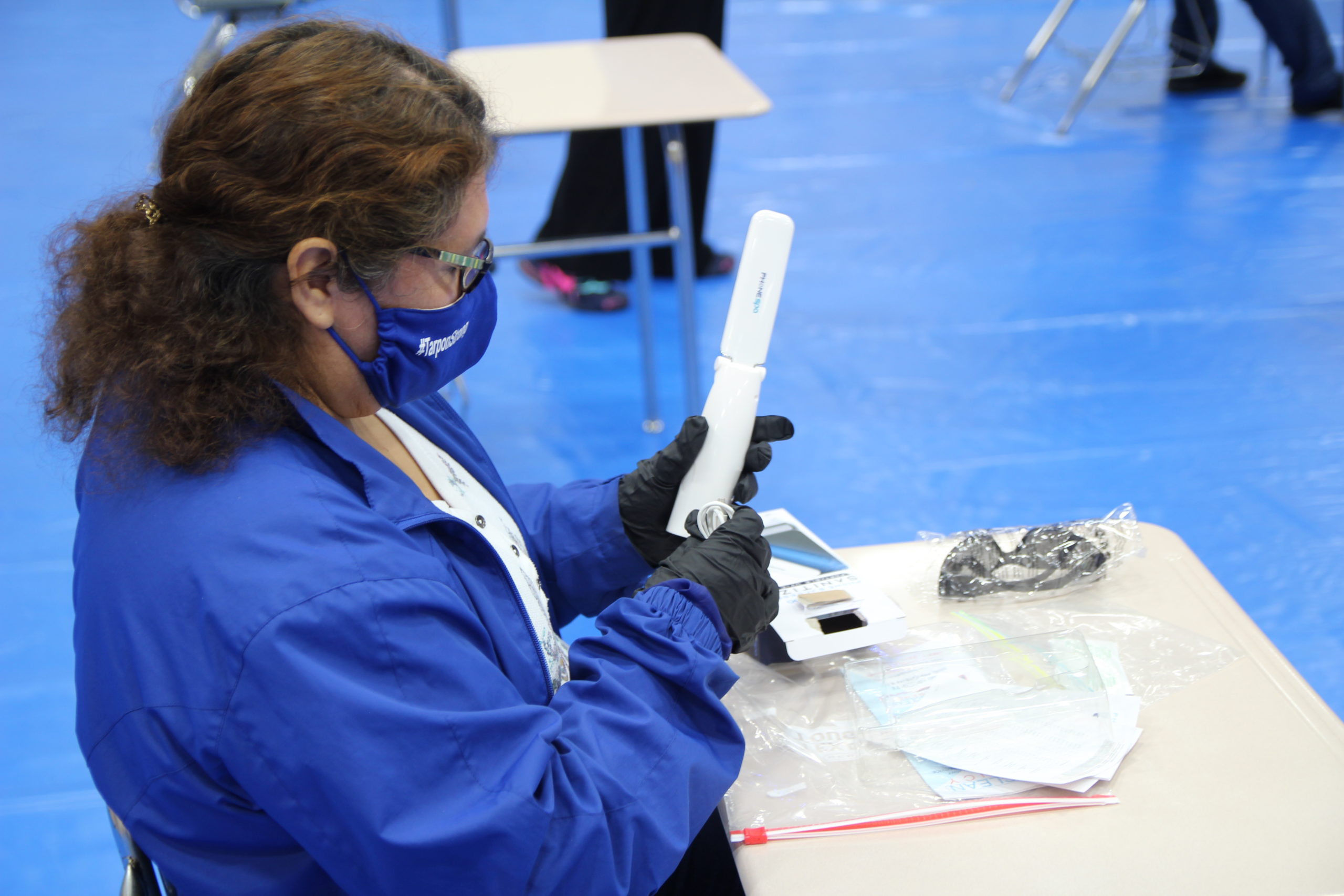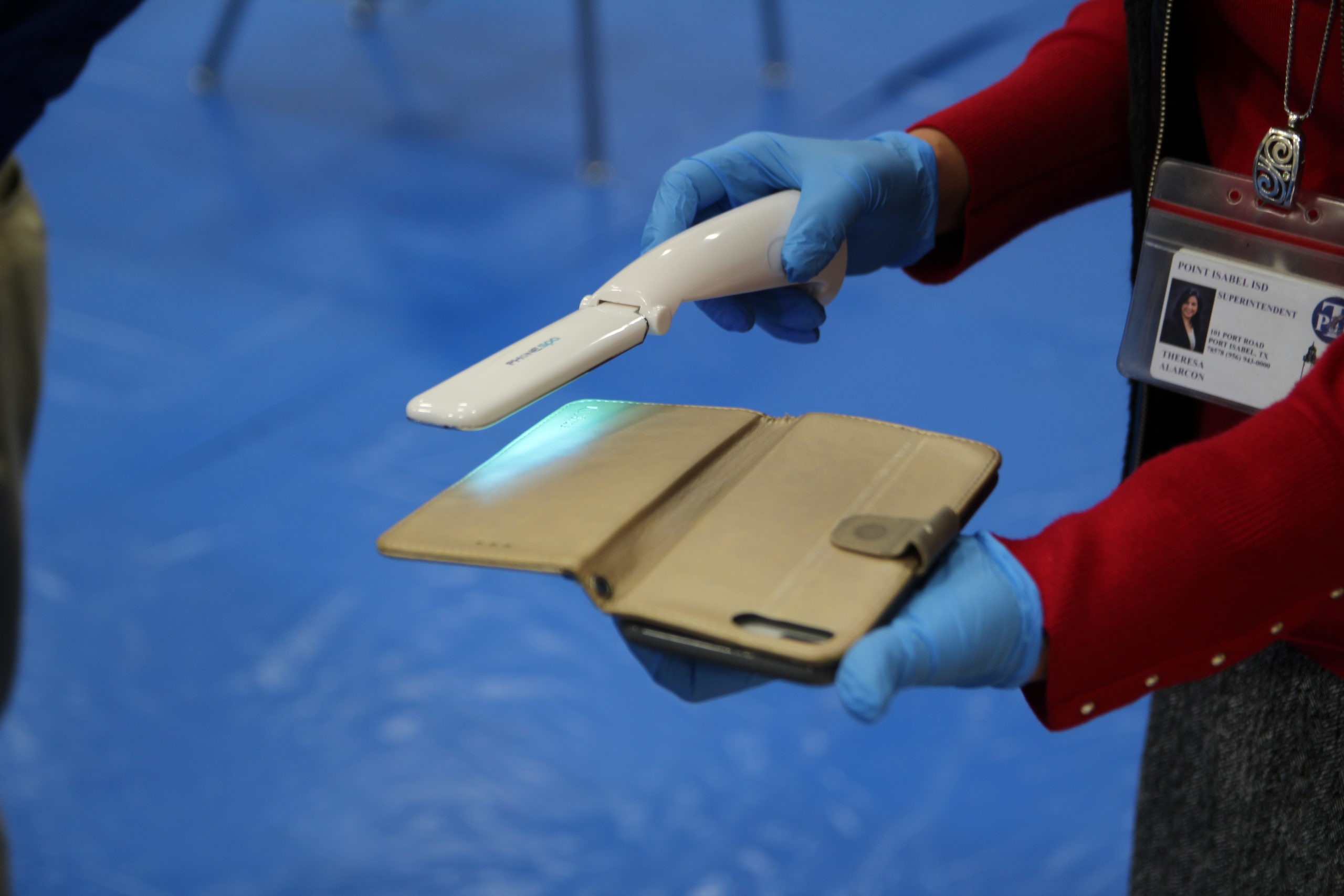 PI-ISD Superintendent Theresa Capistran sterilizing her phone with a hand-held ultraviolet light from UV Clean Agency. Photo by Gaige Davila.