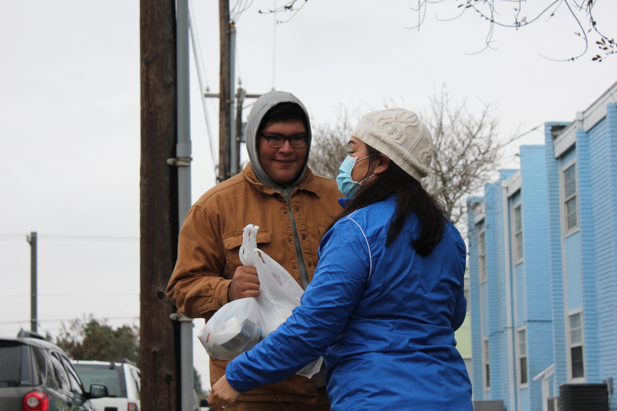 Derry Elementary Principal Maribel Valdez hands a PI-ISD student a meal bundle outside the Villa Madre apartments in Port Isabel on Feb. 26. Photo by Gaige Davila.