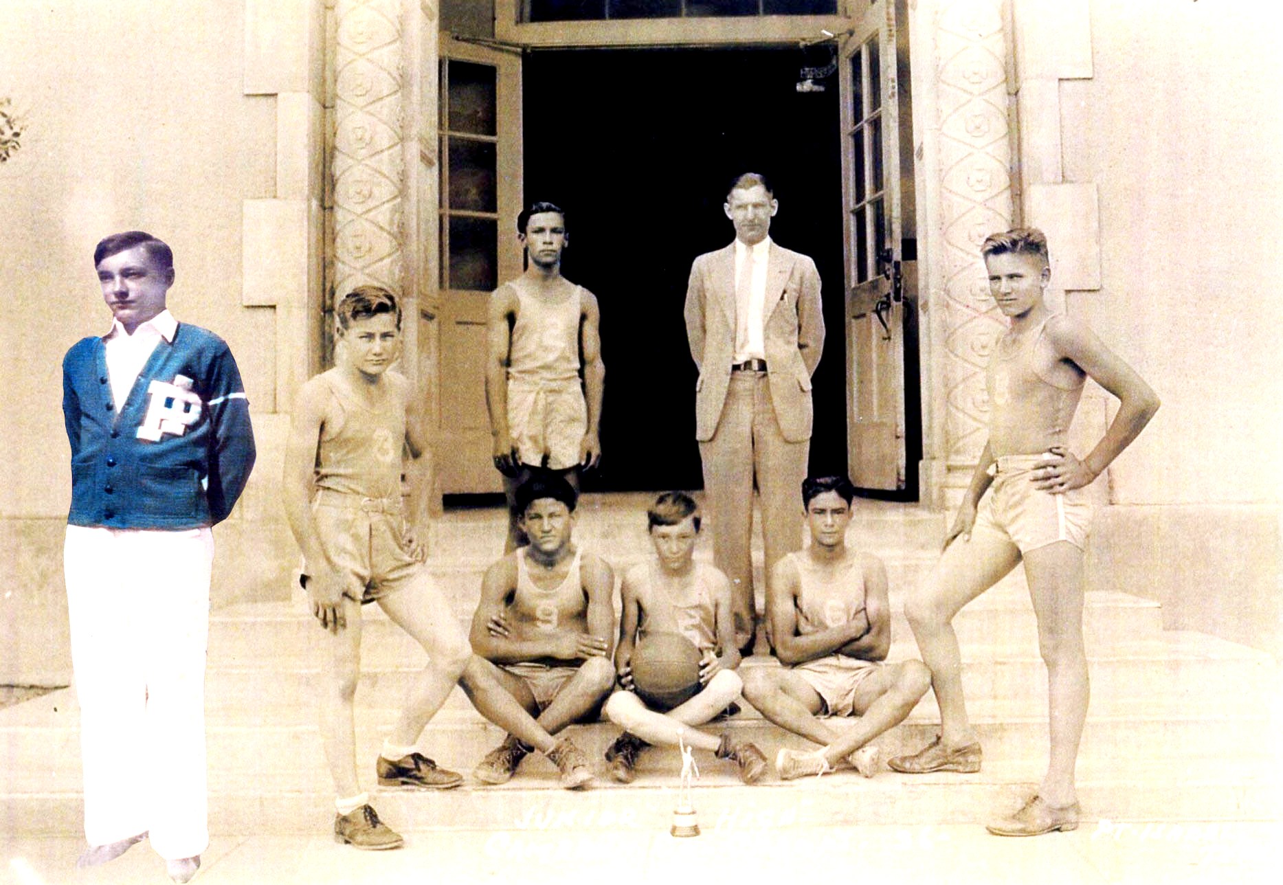 In this composite photo, the 1936 Port Isabel Junior Division Cameron County Champions stand in front of the Port Isabel school building. Standing left to right: Stanley Wells, Manuel Barrientez, Coach Alvon Allmen and Leonard Williams. Sitting L to R: Garza, Carl Chilton and Gonzalo Gonzalez. Colored photo: Brownsville Historian Carl Chilton wearing his P I letterman’s sweater.