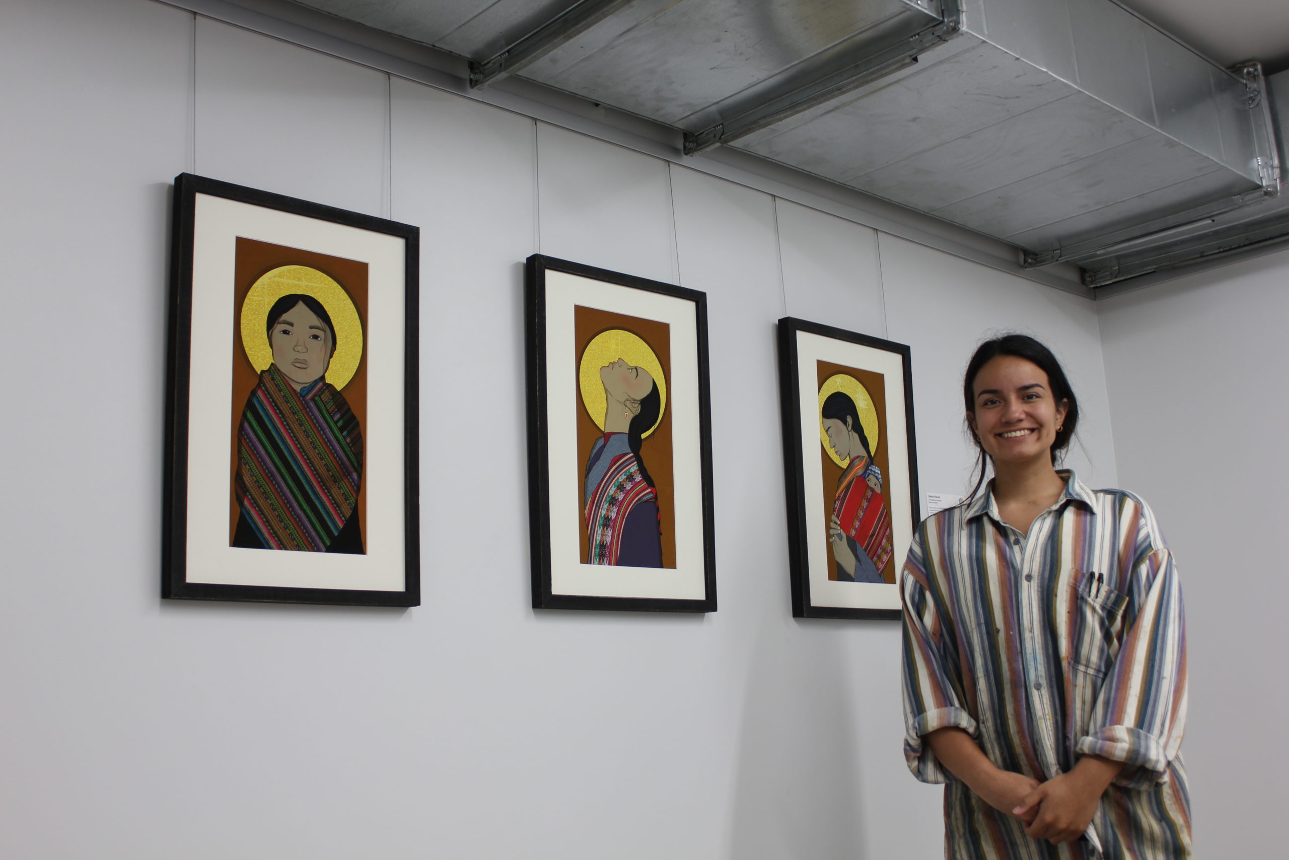 Cristina Piecuch, ABI-SPI resident artist, stands near her work, “The Hardest Question,” in ABI’SPI’s gallery. Photo by Gaige Davila.