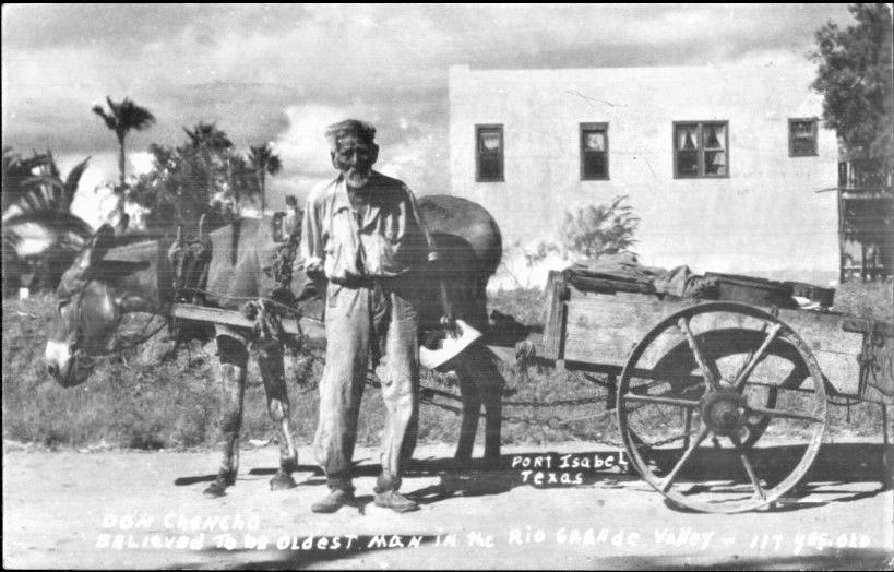 Don Chencho, one of Port Isabel’s most known historical residents, stands near his donkey and wagon in this undated photo taken in Port Isabel. Inscribed on the photo is: “Don Chencho: Believed to be oldest resident in the Rio Grande Valley.”