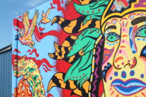 The base layers of the mural were made with house paint, then the alebrijes were spray painted on, freehand, with several layers. Serkit applied color theory to the mural throughout, putting complementary colors together in each alebrije.