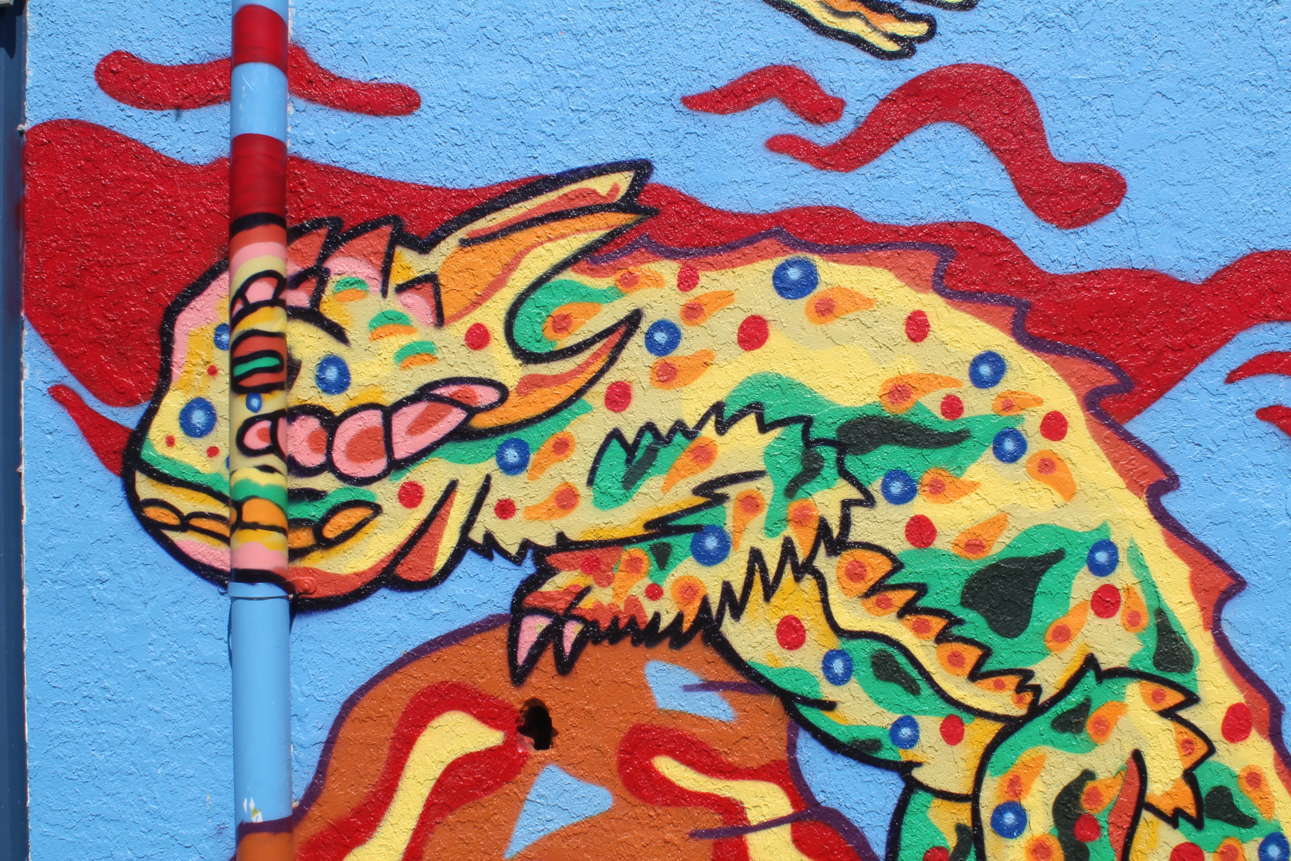 The base layers of the mural were made with house paint, then the alebrijes were spray painted on, freehand, with several layers. Serkit applied color theory to the mural throughout, putting complementary colors together in each alebrije.