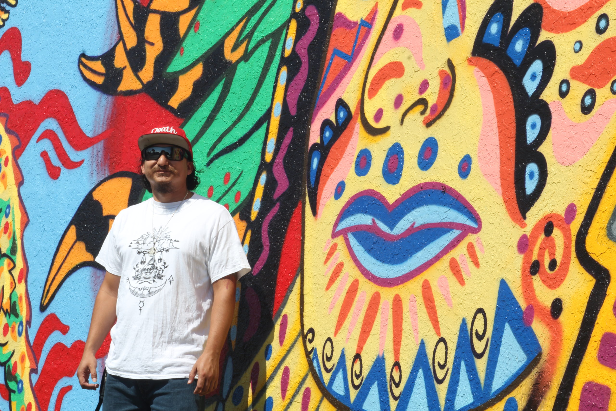 Serkit stands before his alebrije mural on June 18, two days after finishing it. Photo by Gaige Davila.