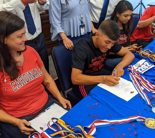 Surrounded by family, friends and coaching staff, former Tarpon athlete Will Camacho, who graduated this past May, signed a scholarship to attend the University of the Incarnate Word in San Antonio. Camacho, a multi-sport standout, will be joining the UIW Cardinals track team. UIW is a division I school that participates in the Southland Conference.