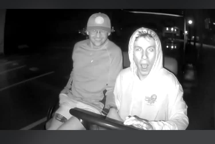 “We just stole a golf cart!” the suspected driver of the golf cart yelled into the phone of the passenger, who looked to be recording the incident. Seconds later, the driver notices the golf cart’s camera and covers it with his hand.