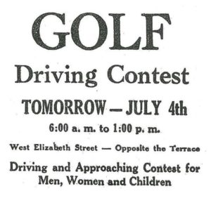 Prizes—Women’s driving: 1st place, dozen balls and one gallon ice cream given by The Terrace Shop, 2nd place, Gold Pencil by Hargrove Stationery and Book Store, and 3rd place, a case of “Orange Thrill” by Valley Bottling Co.