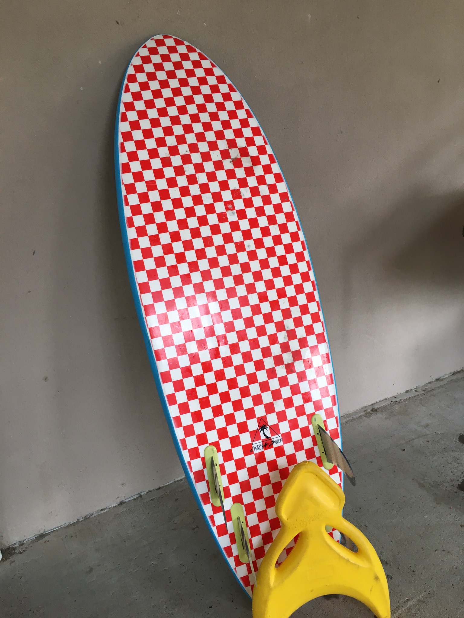 I rode into the park on my fixed gear bike with my surfing gear, backpack, and a jug of water. I was on the way into the jetties when I spotted a dog having a fun run across the road. Riding on a fixed gear with all that stuff is pretty tricky, and so to avoid wrecking into the pooch, I did a launch into the air and wiped out. After glaring at the dog and looking at my bloody knees, I hopped back on the bike and kept on riding because I knew that there would be some epic surf that morning. I arrived at the jetties, leaned my bike against the fence, and decided which surfboard to use. My choice was a 6’5” quad 7S that was ready to charge the epic surf.