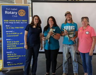 The Rotary Club of Port Isabel Rotarian of the Week, Teresa Bryant, welcomed the SPI Birding, Nature Center and Alligator Sanctuary to speak at the Aug. 11 meeting. Cristin Enholm, Executive Director, and Jake Reinbolt, “The Alligator Guy”, presented an educational program about the American Alligator.