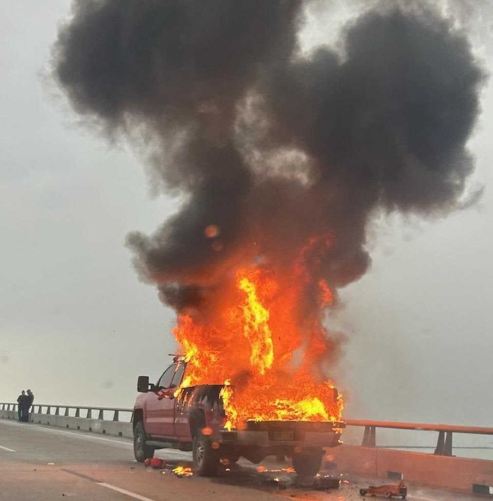 According to police reports, the calls started coming into South Padre Island’s emergency number at 4:38 p.m. regarding a red Silverado pick-up truck with Ohio plates and the bed fully engulfed with fire. The driver and passenger were reported to have safely exited the vehicle. By 4:41, the SPI Police Department was directing traffic at the base of the bridge, and a few minutes later, the causeway was closed to traffic.