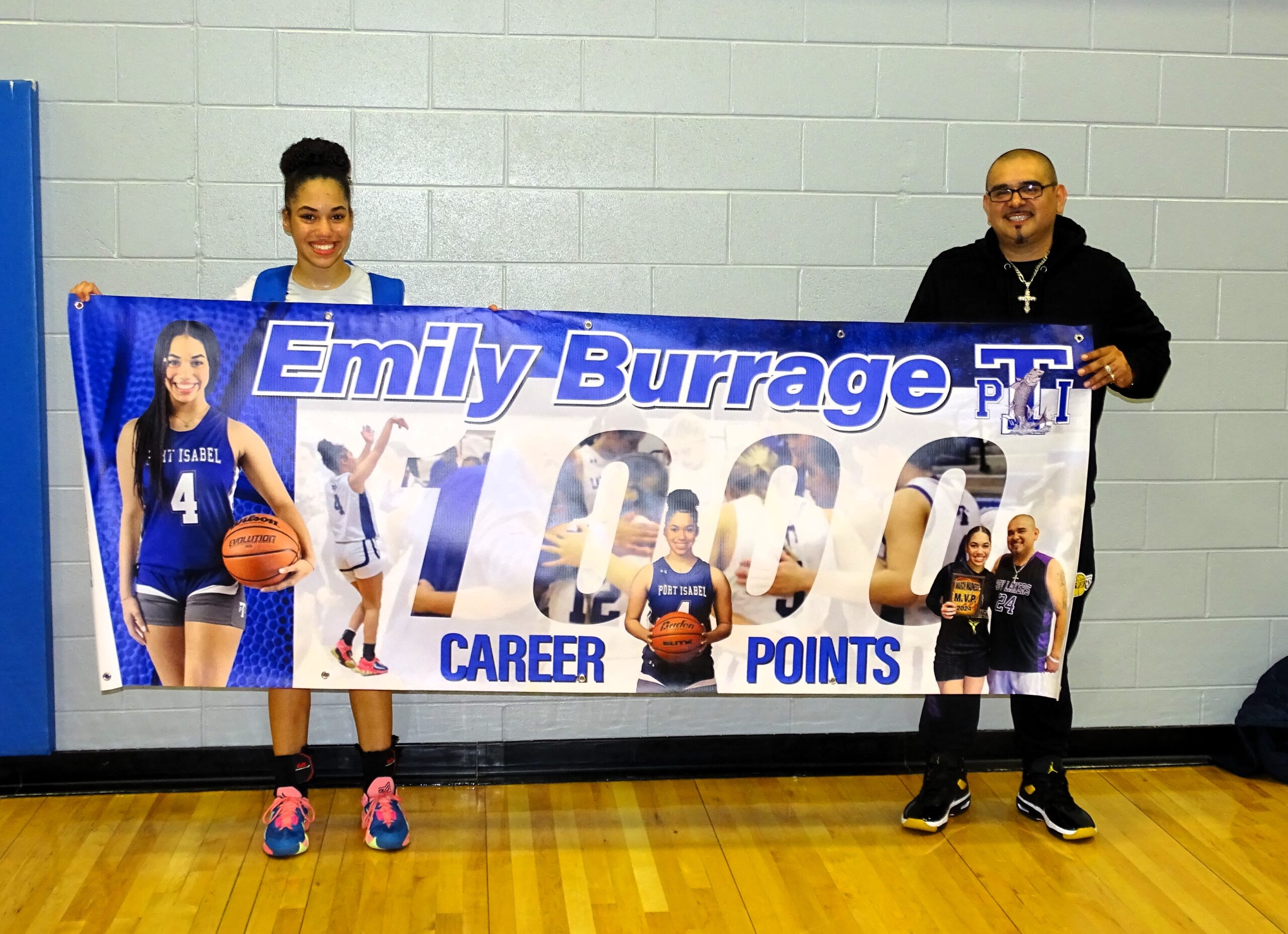 Gary, Robert and Rosa Sanchez donated a banner commemorating Port Isabel Lady Tarpon Emily Burrage’s 1000th point, which she achieved last December. Her traveling coach, Polo Sanchez, presented Burrage with the banner after the Lady Tarpon’s most recent game, on Tuesday, Jan. 7. During this game, Burrage assisted the Lady Tarpons in securing a 56-31 win over the Valley View Lady Tigers with 31 points, 10 steals, seven rebounds and five assists. (Courtesy photo/Constancio Martinez, Jr.)