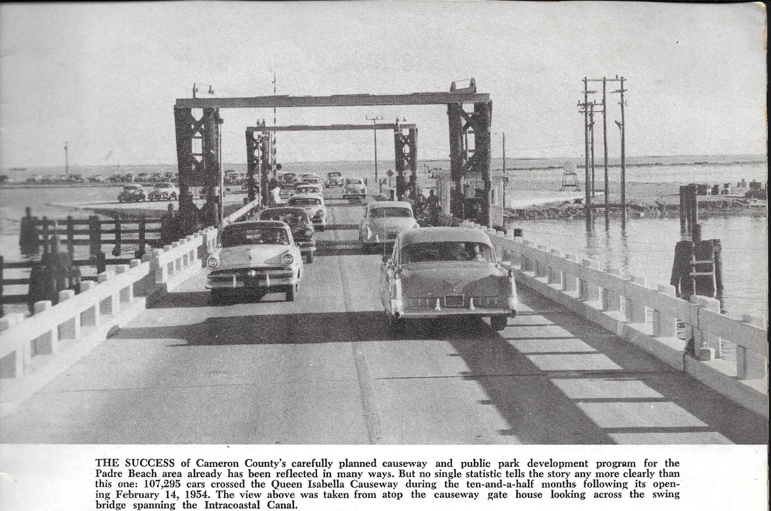 There was nothing on the island yet for visitors, but sand, surf, and sunlight. There is no water line. There are no tourist cabins or bath houses. Yet more than 10,000 people have visited the beach since the Causeway was opened to the public Sunday morning. (Port Isabel Press Feb. 19, 1954)