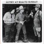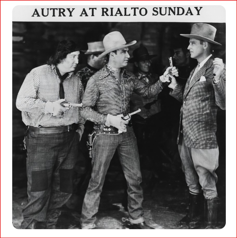 Smiley Burnette and Gene Autry as they appear in a scene from the rip-roaring western “The Singing Hills” which is scheduled for showing Sunday and Monday at the Rialto Theatre in Harlingen. Featured parts are played by Mary Lee and lovely Virginia Dale.