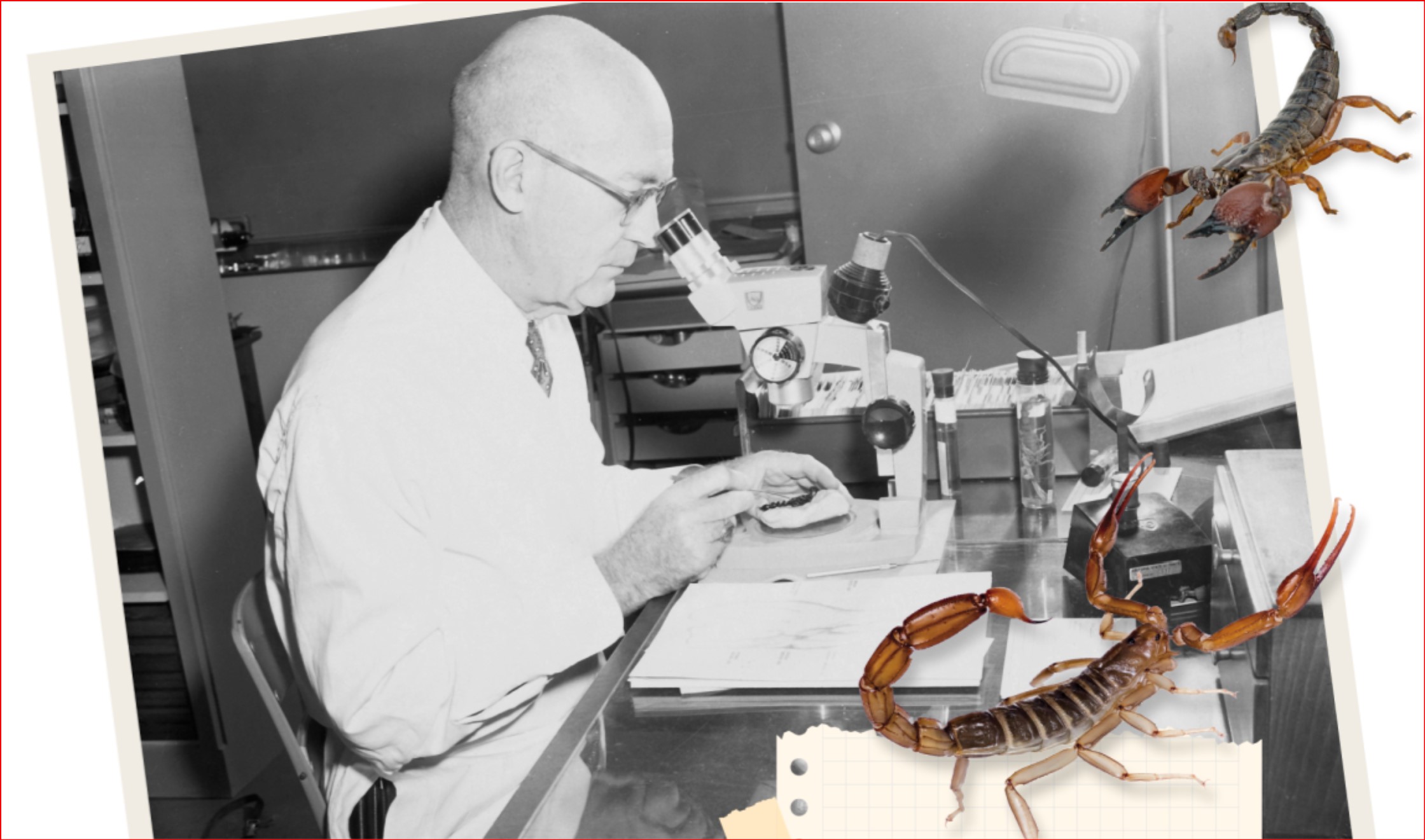 TEMPE, Ariz., Aug. 3 —(AP)— Here’s a man who is on the prowl for a poisonous child-killer, the southwestern scorpion. He doesn’t want them dead, however. He welcomes the brown crawlers with their stingers ready for action. He is Dr. Hebert L. Stahnke, head of the biological science department of Arizona State college. Dr. Stahnke “milks” his scorpions to produce anti-venom serum. The poison is injected into cats in small quantities. Cats are especially invulnerable to the scorpion sting, because of an ability to produce a neutralizing fluid. The cat’s blood is converted into anti-venom serum and is injected into children who suffer scorpion stings. The treatment is one hundred per cent perfect if victims are treated soon after the sting, Stahnke reports. Adults rarely die of a scorpion sting, but they suffer extensively through painful swelling. (Stillwater News-Press Fri, Aug 03, 1951)