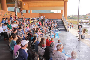 Special to the PRESS Sea Turtle Inc. Director Jeff George, far right, speaks to a crowd of visitors at the brand new outdoor amphitheater during the grand opening of Sea Turtle Inc.’s $6 million facility last Saturday. Crowds encircled the building as they waited for their chance to see the inside of the new education …